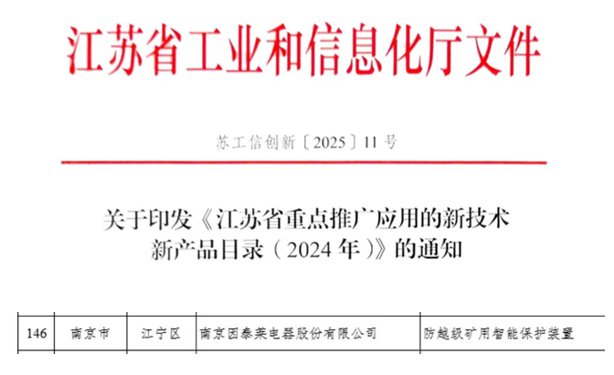 南京因泰萊防越級(jí)礦用智能保護(hù)裝置入選江蘇省“兩新”產(chǎn)品目錄